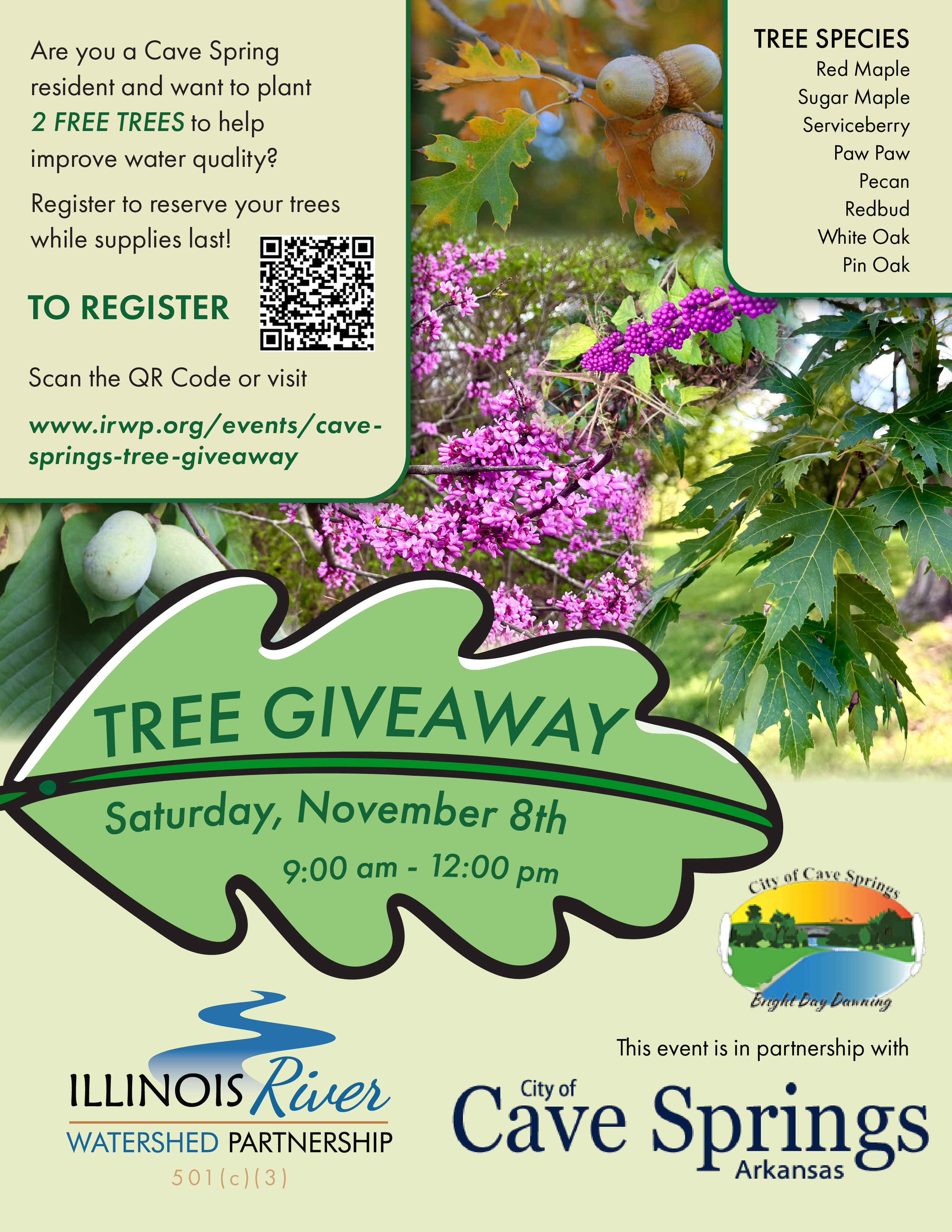 Pickup for your reserved trees will be along Highfill Road (between First Baptist Church and IRWP Lake) Saturday morning from 9:00 am to 12:00 pm. We will have staff and volunteers available to help!