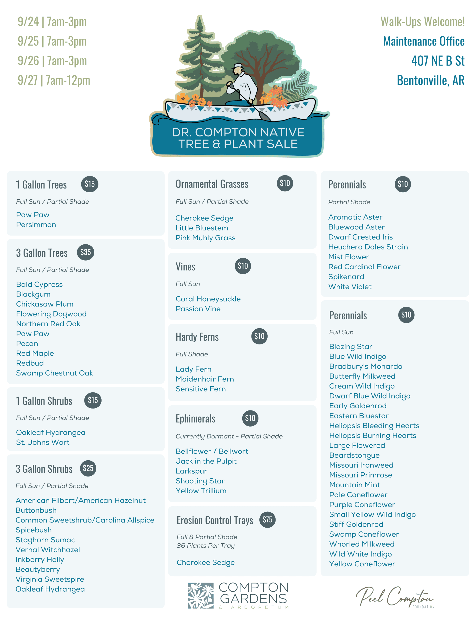 Dr. Compton Native Tree & Plant Sale Wednesday, September 24, 2025 9:00 AM Friday, September 26, 2025 12:00 PM Compton Office 407 Northeast B Street Bentonville, AR, 72712 United States (map) Google Calendar ICS Stop by the annual fall Dr. Compton Native Tree & Plant Sale to shop over 65 varieties of trees, shrubs, vines, ornamental grasses, perennials, and hardy ferns.Walk-ups are welcome, no reservation needed.