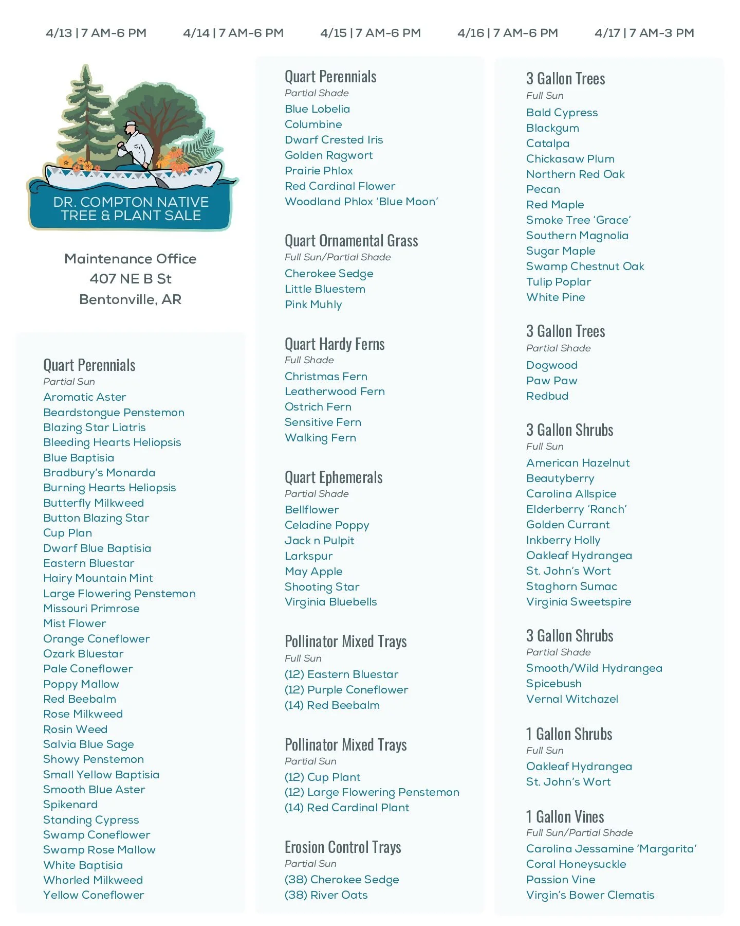 Back to All Events Dr. Compton Native Tree & Plant Sale Monday, April 13, 2026 7:00 AM Friday, April 17, 2026 3:00 PM Compton Office 407 Northeast B Street Bentonville, AR, 72712 United States (map) Google Calendar ICS Stop by the annual fall Dr. Compton Native Tree & Plant Sale to shop over 65 varieties of trees, shrubs, vines, ornamental grasses, perennials, and hardy ferns.Walk-ups are welcome, no reservation needed.