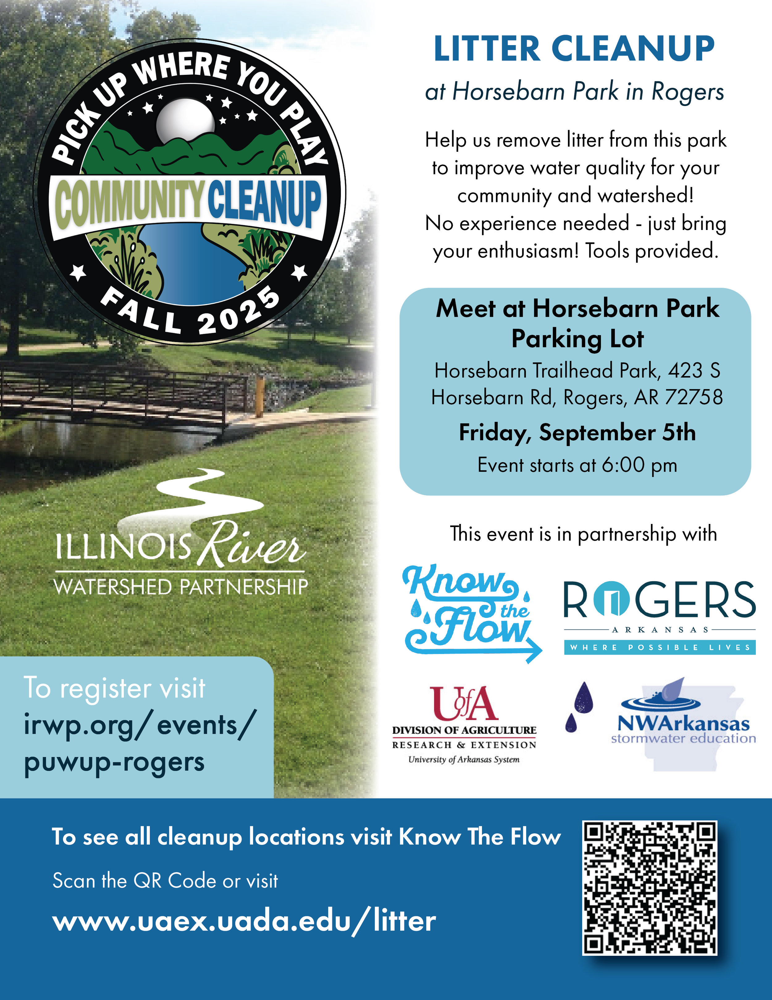 The University of Arkansas System Cooperative Extension Service, specifically Stormwater Education, hosts the Pick Up Where You Play Cleanups every year across the Illinois River Watershed and the Beaver Lake Watershed. IRWP wants to support them as they work to improve our water quality in any way we can, so we are happy to partner with them to support their mission and lead cleanups with them!