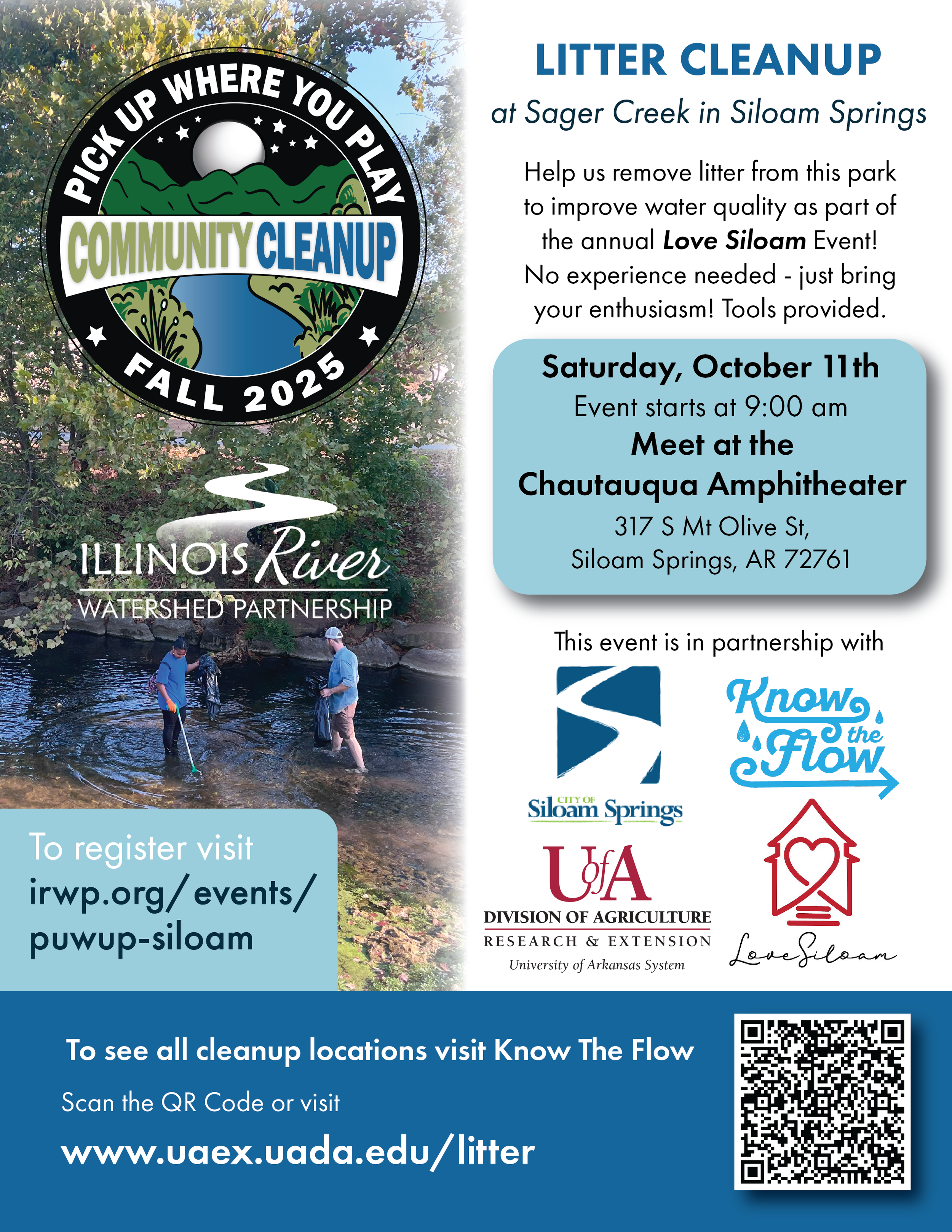 The University of Arkansas System Cooperative Extension Service, specifically Stormwater Education, hosts the Pick Up Where You Play Cleanups every year across the Illinois River Watershed and the Beaver Lake Watershed. IRWP wants to support them as they work to improve our water quality in any way we can, so we are happy to partner with them to support their mission and lead cleanups with them!