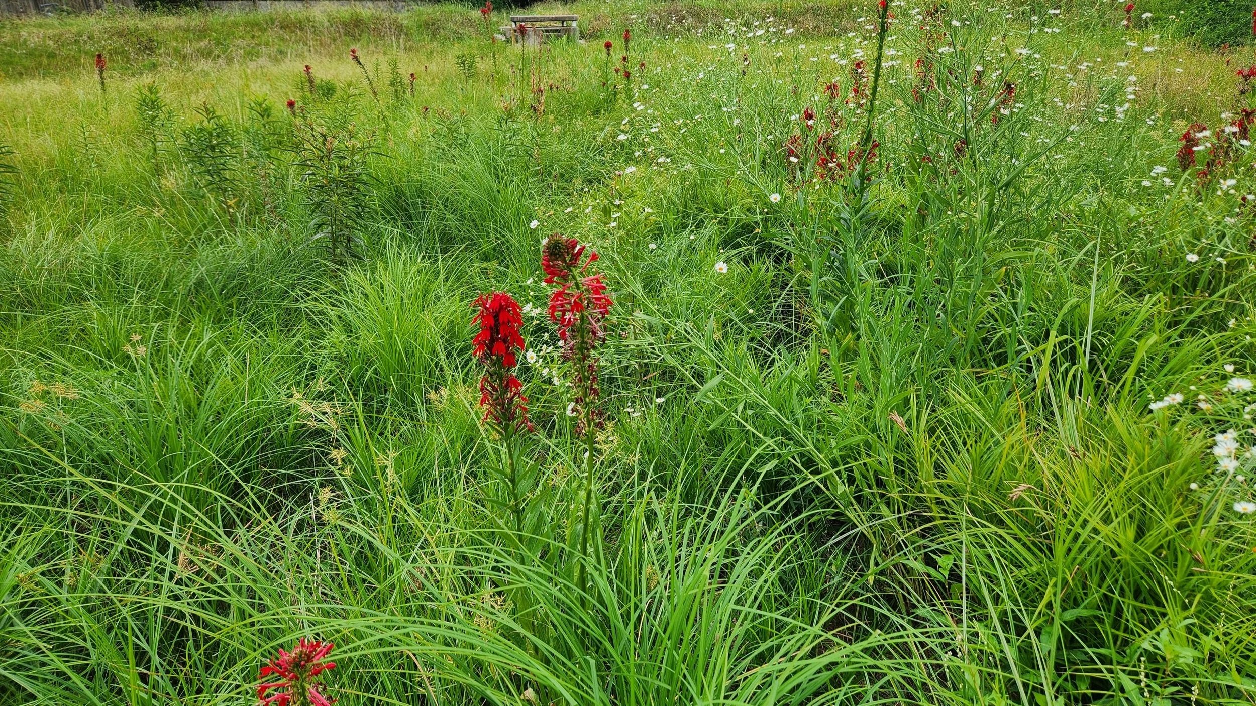 Upright, slender forb with many alternate leaves. Small white flower clusters in the summer. Resembles alfalfa from distance.